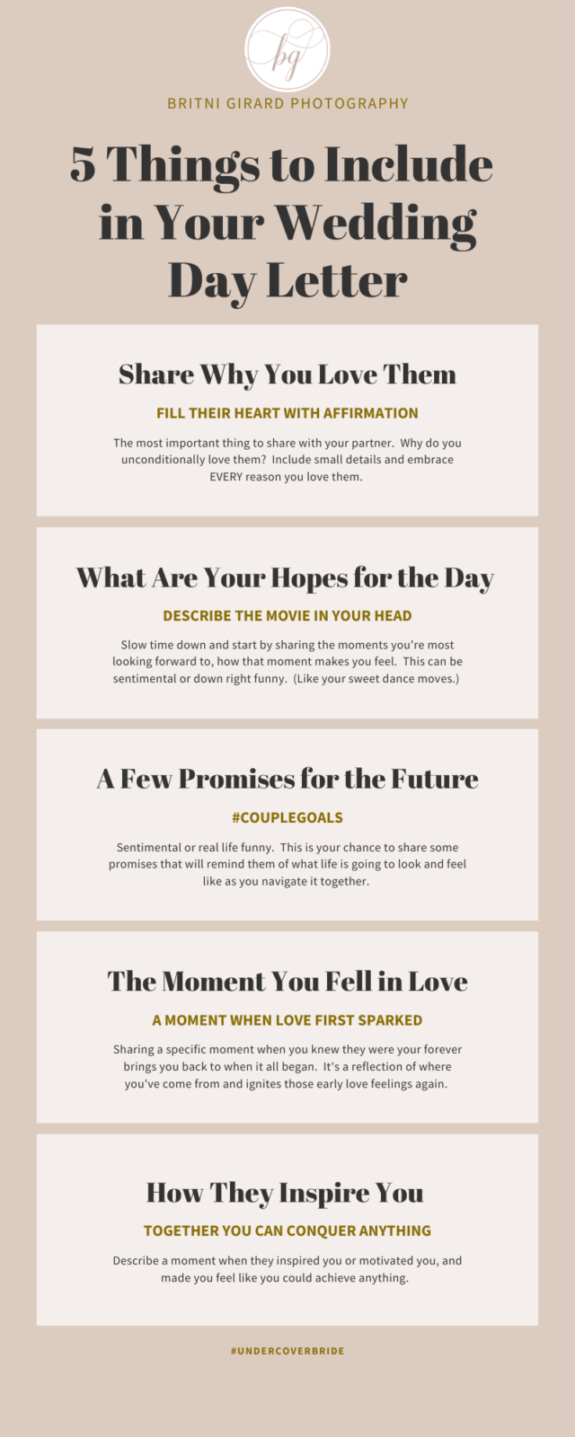 Be sure to arrange for a family member or person from your wedding party knows to “deliver” the letter to your partner on the morning of your wedding.